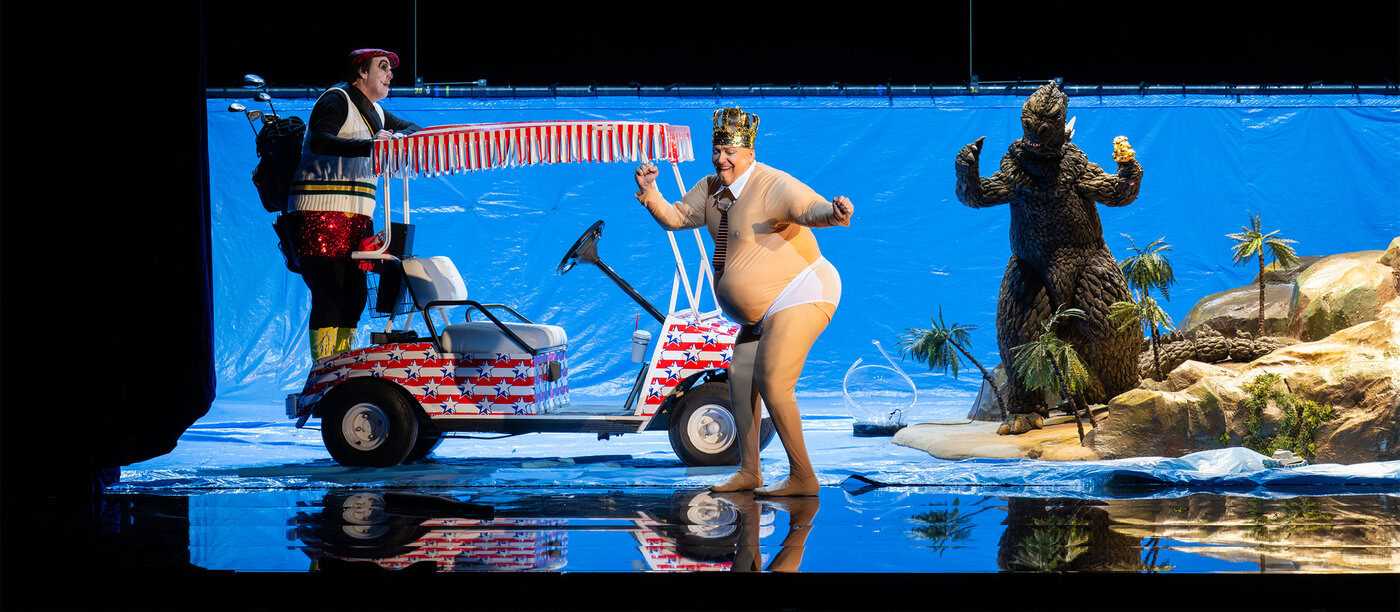As a result, the levels often drift apart. Added to this is the colorful and yet sometimes unimaginative scenic design. Director Tobias Kratzer and his team sometimes struggle to get the banter going, but they manage to create magnificent images at the climaxes. The battle of the monsters with Gorgonzilla (Anna Clementi) and the President (excellent: Georg Nigl) becomes a larger-than-life shadow theater. The final scene in the sea floods the eye and ear thanks to the skillfully employed cinematic means that Neuwirth loves so much. There is so much to experience, almost too much, because all the scenes, even the really successful ones, are too long and too cumbersome. The play could be cut down by a good third. The only thing that would be lost would be the precarious non-quality that characterizes the work to some extent.