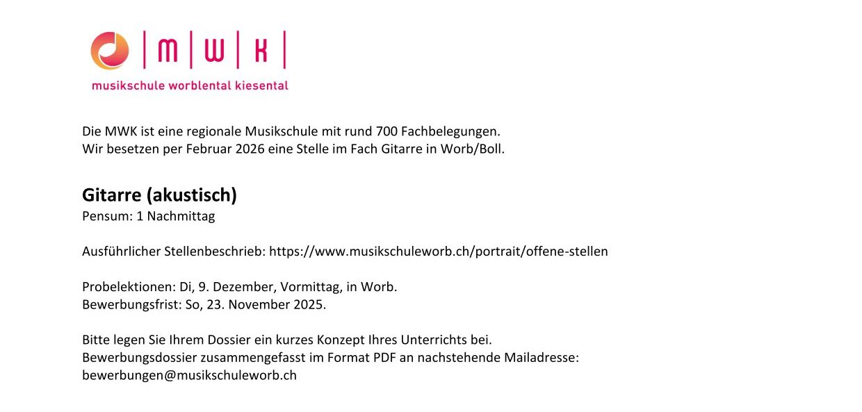 Guitar (acoustic) bewerbungen@musikschuleworb.ch https://www.musikschuleworb.ch/portrait/offene-stellen