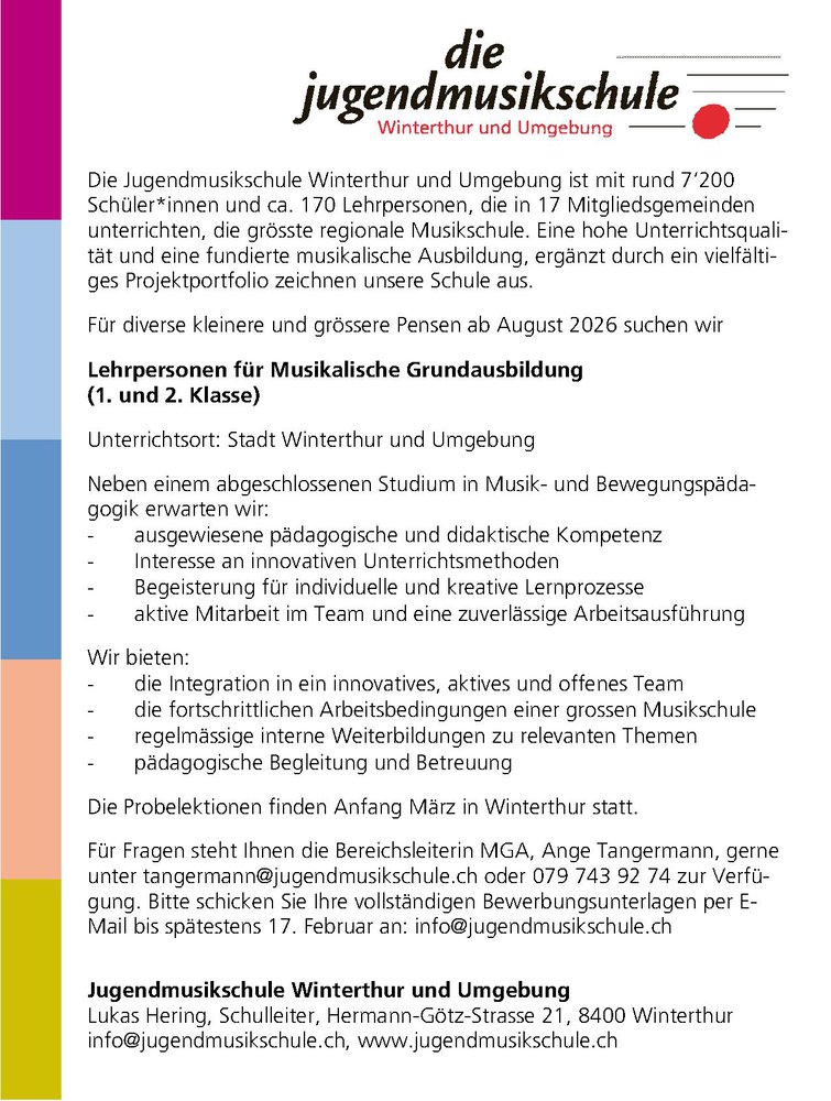 Insegnanti per l'educazione musicale di base (1° e 2° grado) info@jugendmusikschule.ch www.jugendmusikschule.ch