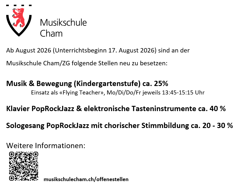 Musica e movimento (ca. 25%) - Pianoforte/el. Tastiera Inst. PopRockJazz (ca. 40%) - Canto solista PopRockJazz (ca. 20-30%) musikschulecham.ch/uffici