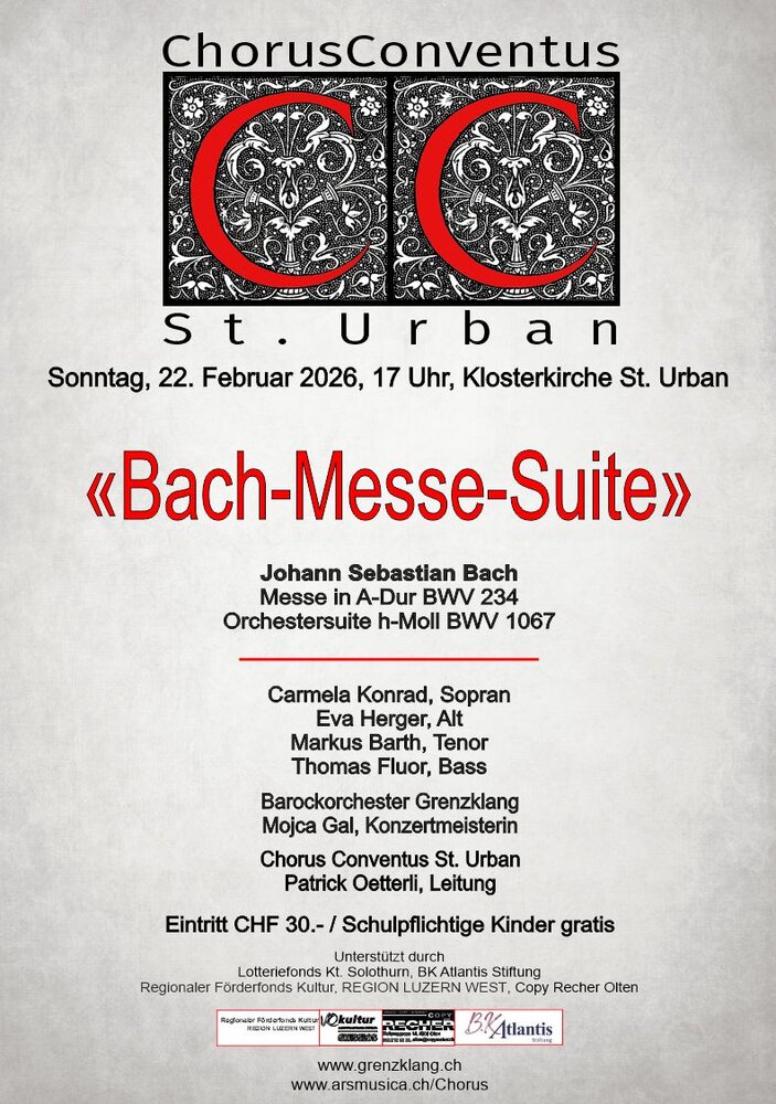 Die Werke welches Komponisten nehmen Sie mit auf die Insel? Mozart, unbedingt. Verdi, auch verständlich. Wagner, klar doch, Sie haben ja Zeit. Trotzdem würde ich wetten, der gute alte Johann Sebastian Bach erhält die meisten Voten. Und ist das Lieblingswerk aus seinem Oeuvre zu nennen, stehen h-Moll-Messe und Matthäuspassion ganz zuvorderst. Auch die h-Moll Orchestersuite dürfte einen respektablen Platz einnehmen, ganz besonders bei Freunden der Querflöte. Die lutherische Messe in A-Dur ist da schon eher ein Geheimtipp, aber ein vielversprechender. Zu überprüfen im Konzert des Chorus Conventus St. Urban mit vielen Mitmusizierenden, bei dem gilt: Wo Johann Sebastian draufsteht, ist auch Johann Sebastian drin.