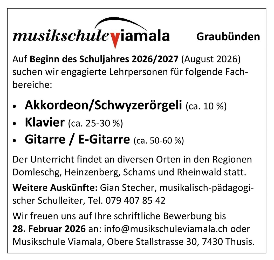 Akkordeon/Schwyzerörgeli (ca. 10%) – Klavier (ca. 25-30%) – Gitarre/E-Gitarre (ca. 50-60%) info@musikschuleviamala.ch