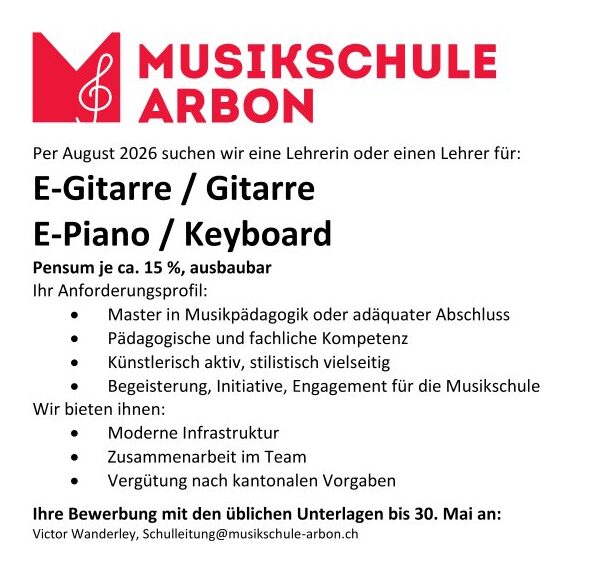 E-Gitarre/Gitarre – E-Piano/Keyboard – Pensum je ca. 15%, ausbaubar schulleitung@musikschule-arbon.ch