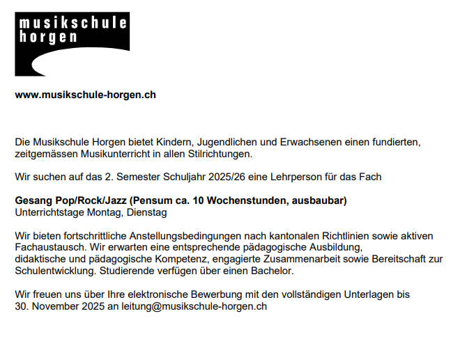 Gesang Pop/Rock/Jazz (Pensum ca. 10 Wochenstunden, ausbaubar)
