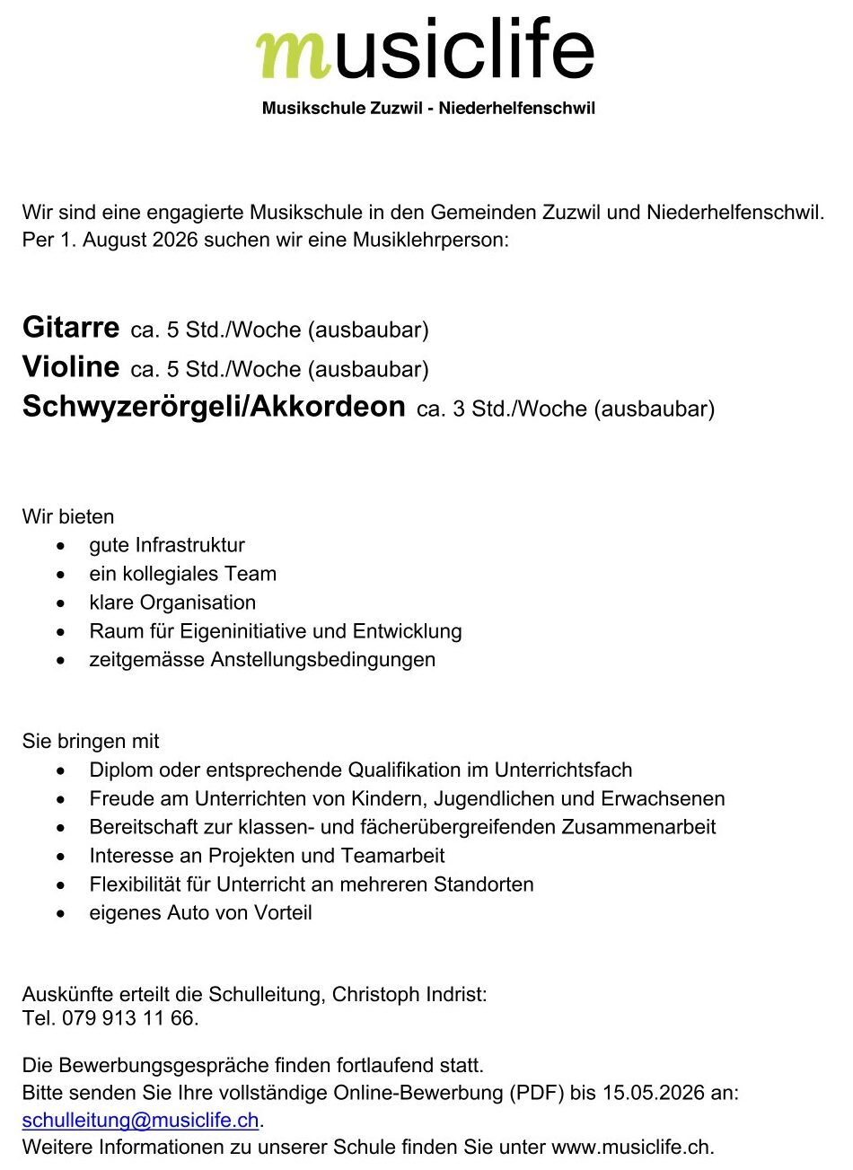 Gitarre ca. 5 Std./Woche (ausbaubar) Violine ca. 5 Std./Woche (ausbaubar) Schwyzerörgeli/Akkordeon ca. 3 Std./Woche (ausbaubar) schulleitung@musiclife.ch www.musiclife.ch