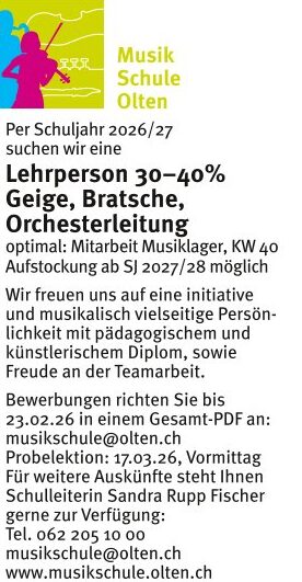 Lehrperson 30–40% Geige, Bratsche, Orchesterleitung