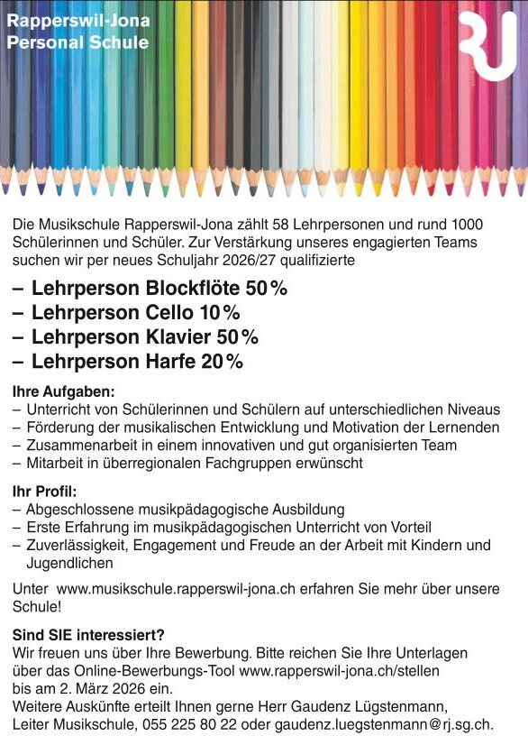 Lehrperson Blockflöte 50 % – Lehrperson Cello 10 % – Lehrperson Klavier 50 % – Lehrperson Harfe 20 %