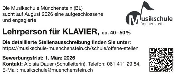 Lehrperson für Klavier, ca. 40-50% musikschule@muenchenstein.ch https://musikschule-muenchenstein.ch/schule/offene-stellen