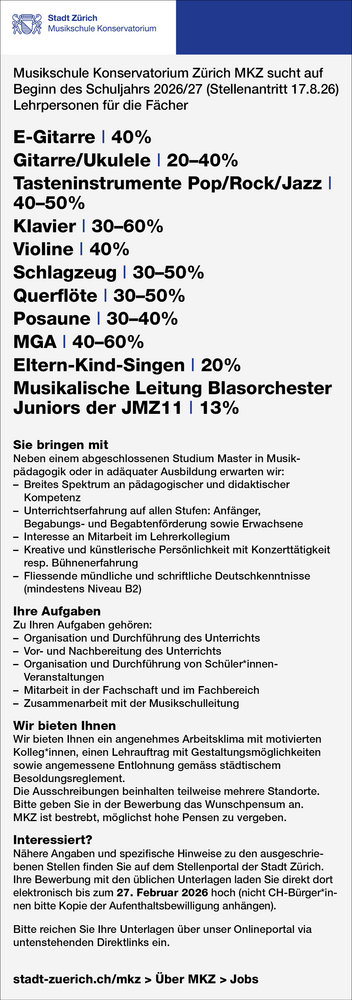 Musikalische Leitung Blasorchester Juniors der JMZ11, 13 % | Stadt Zürich