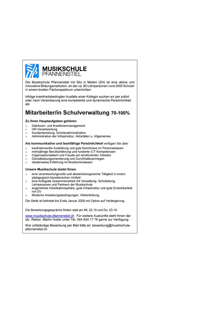 Ihre vollständige Bewerbung per Mail bitte an: bewerbung@musikschule-pfannenstiel.ch