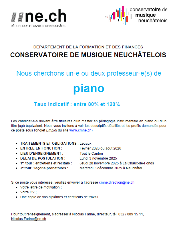 Nous cherchons un-e ou deux professeur-e(s) de piano cmne.direction@ne.ch www.cmne.ch Nicolas.Farine@ne.ch