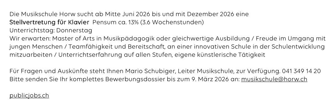Stellvertretung für Klavier, Pensum ca. 13% (3.6 Wochenstunden)